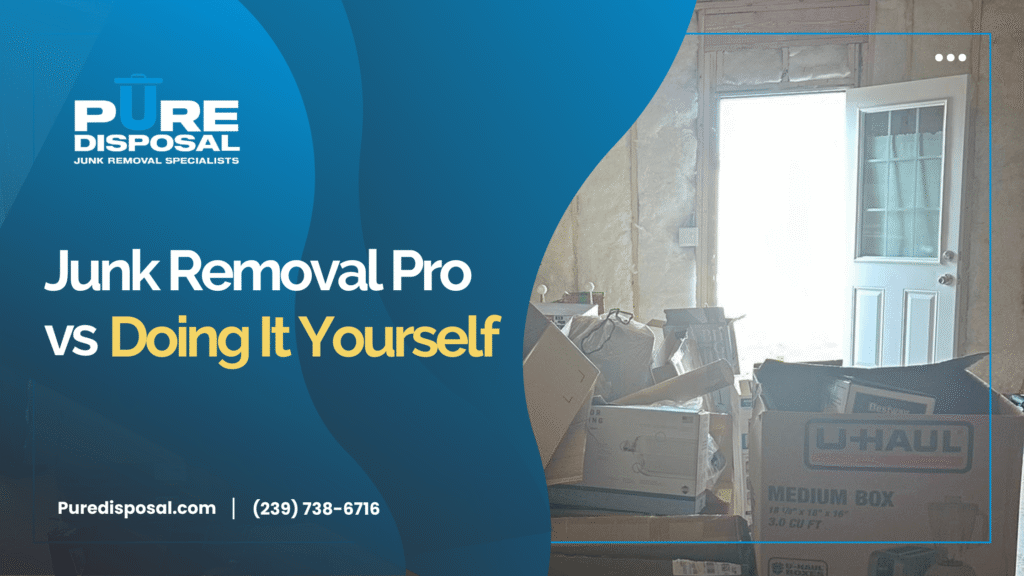 Are you staring at a garage so packed you can’t park your car, or a spare bedroom overflowing with old furniture and boxes? Living in Fort Myers, Cape Coral, Naples and nearby communities means we enjoy beautiful weather—but it also means stuff accumulates quickly. Whether it’s hurricane preparedness gear, beach equipment, seasonal decorations or sentimental items, clutter builds up. When you’re ready to clear it out, you have two main choices: do it yourself or hire a professional. This blog compares the pros and cons of DIY vs. professional junk removal with an emphasis on the unique needs of Southwest Florida homeowners and businesses. We’ll cover pricing, safety, environmental considerations and legal requirements. Throughout the article you’ll notice references to industry research and official guides for context, but the focus remains on how Pure Disposal can help you reclaim your space efficiently, safely and responsibly. Pricing & Cost Transparency in Junk Removal National and Local Averages Understanding cost is crucial when deciding how to remove clutter. Nationwide, the typical junk removal job ranges from $150 to $350 for most homeowners, with minimum jobs starting around $70. Pricing is usually based on the volume of debris, measured by the amount of space it occupies in a truck. A full‑size truckload (about 450 cubic feet) often costs around $550. Here in Southwest Florida, costs are comparable but slightly higher due to regional disposal fees. Local cost guides show that typical jobs run between $115 and $345, while full loads can reach $675. Prices increase incrementally based on how many cubic feet of space your items take up, with tiers for minimum, one‑eighth, quarter, half and full loads. A 2025 regional pricing guide notes that junk removal in Fort Myers, Cape Coral and Naples ranges from $100 to $700. Smaller loads (around 1/8 of a truck) cost $100–$150, while half‑loads run $300–$400 and full trucks (15–20 cubic yards) cost $600–$700. These prices usually include labor, proper disposal or recycling, transportation and cleanup. Charges may be higher for same‑day service or oversized items like hot tubs or pianos. Hourly vs Volume‑Based Rates Some companies, particularly for small jobs, offer hourly pricing. Industry guides suggest that hourly rates typically range from $75 to $150 per hour, with a minimum of one or two hours. Hourly pricing can be straightforward, but if the job takes longer than anticipated it can quickly become more expensive than volume‑based pricing. Volume‑based rates, which most companies—including Pure Disposal—use, depend on the amount of space your items occupy in the truck. In general, the bigger the load, the lower the cost per cubic yard. Factors That Influence Cost Dumpster Rental vs. Junk Removal Renting a dumpster might seem like a cheaper alternative, but it often costs $90–$840 for three to four days and requires permits, overage fees and dump charges. You’re responsible for all lifting, sorting and transporting of items yourself. Renting multiple dumpsters may be necessary if you have mixed materials, since some providers don’t accept items with Freon or yard debris in the same container. When you hire a full‑service junk removal company like Pure Disposal, you pay only for the space your items take up and our team does all the heavy lifting, sorting and disposal. DIY Junk Removal: Pros & Cons Benefits of Doing It Yourself Disadvantages & Safety Risks Professional Junk Removal: Pros & Cons Advantages of Hiring Professionals Potential Drawbacks Making the Right Choice: DIY vs Professional Assess Job Size and Complexity Compare Total Costs Calculate expenses beyond the initial price quote. DIY costs include truck rental, fuel, landfill fees, equipment, potential injury treatment and property repairs. In many cases, professional pricing is comparable once you factor in these hidden costs. Evaluate Risk & Safety Consider your physical ability and the help you have available. If lifting heavy items could cause injury, professional removal is the safer option. Consider Environmental Impact Professionals are more likely to recycle and donate items, keeping them out of landfills. With Pure Disposal, you can trust that we prioritize eco‑friendly practices and partner with local charities. Control & Sentimentality If you need to sort through sentimental items, you may prefer to do that part yourself and then call professionals for the heavy lifting. We’re flexible—sort items at your own pace and then schedule our team for pickup. Residential Junk Removal: Our Local Expertise Clutter, Garages and Estates Southwest Florida residents face unique clutter challenges. From hurricane shutters to beach gear and seasonal decorations, our garages and spare rooms fill quickly. As a local company, we understand the demands of coastal living and the need for quick cleanup after storms or seasonal transitions. Attics, Basements & Storage Spaces Many Cape Coral and Naples homes have attics or crawl spaces filled with decades of stored items. Hauling boxes down narrow stairs or through tight attic hatches can be dangerous. Our attic cleanouts service safely clears these spaces using proper equipment. Commercial Junk Removal: Offices, Construction & More Local businesses, property managers and contractors often need large‑scale junk removal. With Pure Disposal, you can schedule pickups to suit your project timeline: Furniture & Appliance Removal Curbside garbage services in Fort Myers do not pick up heavy items like couches. Pure Disposal fills this gap by handling: Light Demolition & Hauling Junk removal sometimes involves demolishing small structures. We offer light demolition services that include dismantling sheds, decks, cabinets and non‑load‑bearing walls. Eco‑Friendly Junk Removal & Sustainability America’s Waste Problem & Why It Matters The Unit